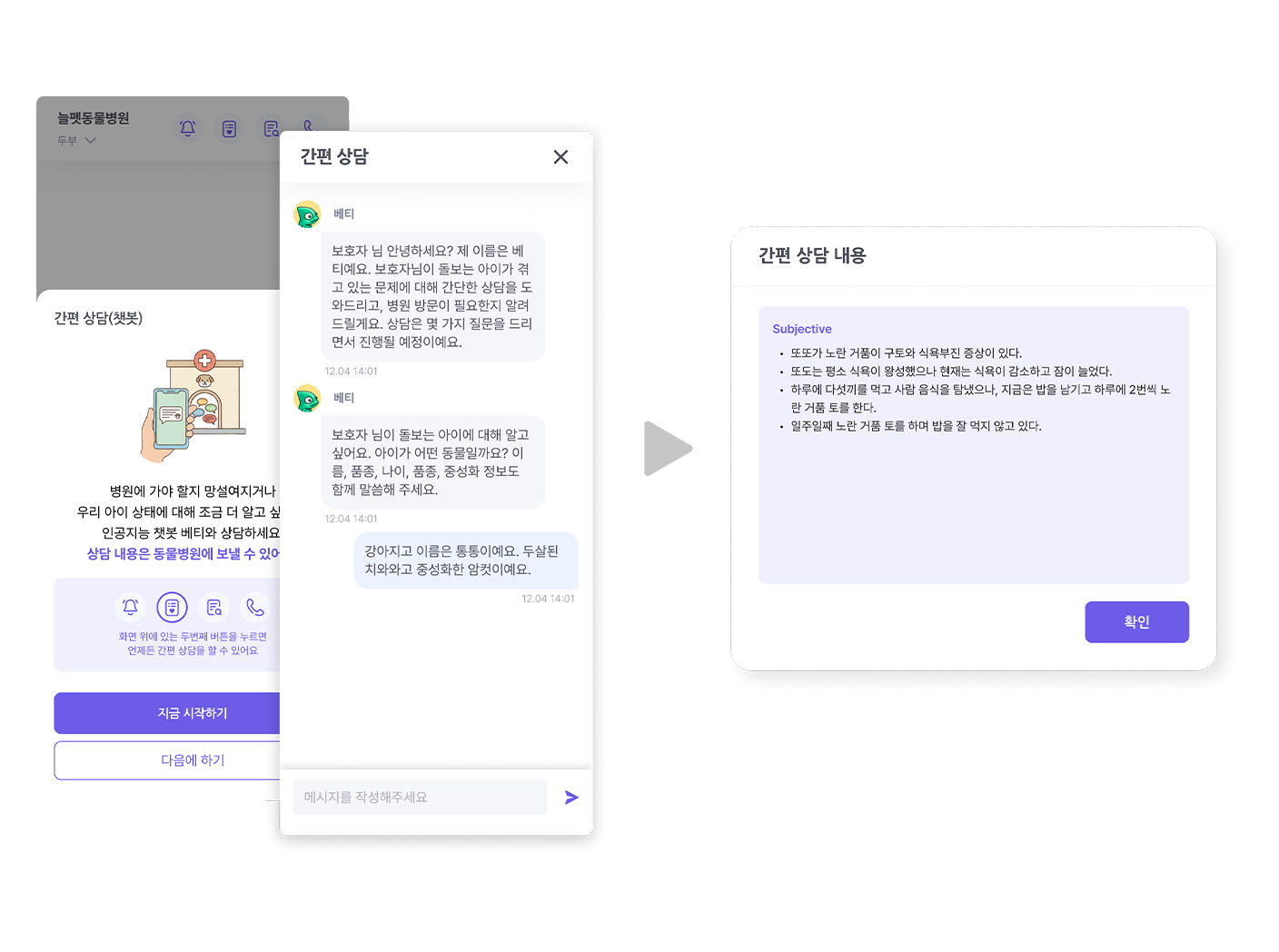 - 반려동물의 상태를 파악해 응급도(Triage)를 분류하고 내원 필요 여부를 안내합니다.
